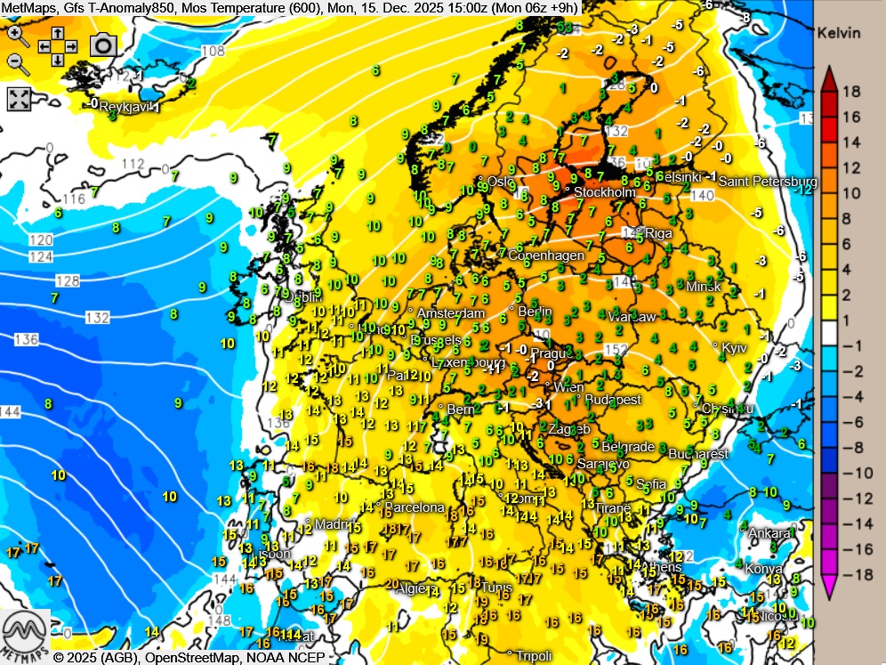 Die Temperaturabweichung in 1.500 m Höhe in Europa sowie die Wetter- / Temperaturkarte für Montagnachmittag nach GFS: