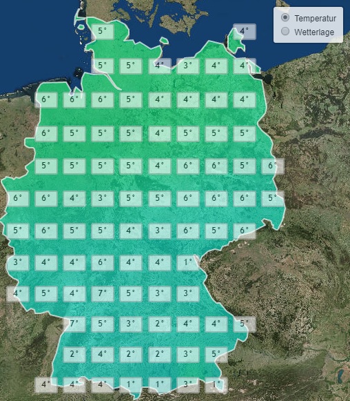 Während sich die Höchsttemperaturen am Nachmittag in weiten Teilen des Landes bei Werten um die 5 Grad einpendeln, bleibt es im Süden etwas kühler. Vor allem am Alpenrand steigt das Quecksilber im gesamten Tagesverlauf kaum einmal über den Gefrierpunkt. In höheren Lagen herrscht Dauerfrost.