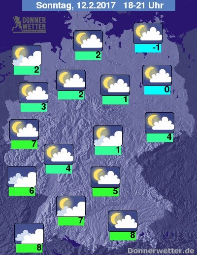 Heute Abend zeigt sich der Himmel oft locker oder gering bewölkt. Dichtere Wolken finden sich im Südwesten der Republik und gebietsweise auch über dem Norden und der Landesmitte. Es bleibt überall trocken bei Abendwerten von -1 Grad an der Müritz und bis 8 Grad in Freiburg.