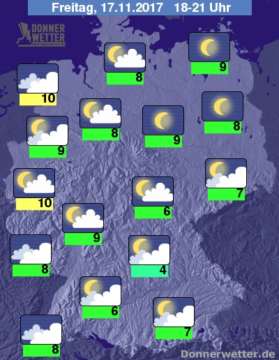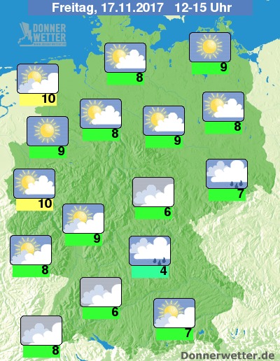 Die Höchstwerte liegen zuvor zwischen kühlen 4 Grad im Thüringer Bergland und vergleichsweise milden 10 Grad am Niederrhein und der Nordsee.