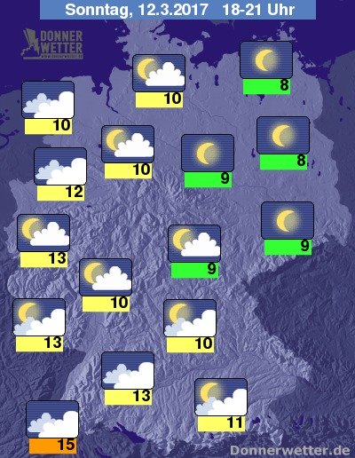Heute Abend bleibt es in den östlichen Landesteilen meist sternenklar oder nur locker bewölkt. Dichte Wolken halten sich vor allem über dem Emsland sowie im Südwesten Deutschlands. In den übrigen Regionen ist es locker bis aufgelockert bewölkt. Es bleibt bundesweit trocken bei 8 bis 15 Grad.