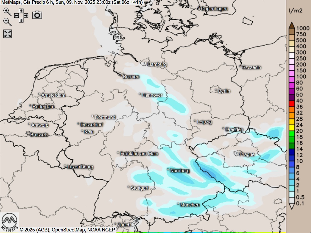 Die Temperaturkarte für Sonntagnachmittag (15:00 Uhr) sowie die Sechs-Stunden-Regenmengen bis 23:00 Uhr nach GFS: