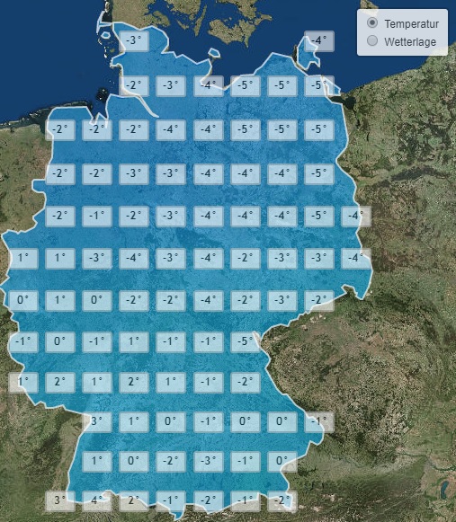 Nach einem frostigen Start in den Tag mit teils zweistelligen Minusgraden steigt das Thermometer im Tagesverlauf merklich an. Dabei wird es vielerorts einige Grad wärmer als an den vorangegangenen Tagen. Während der Nordosten bei Höchstwerten um die -5 Grad nach wie vor bibbert, klettert das Thermometer im Südwesten bereits wieder über die Nullgradgrenze und erreicht am Oberrhein bis zu +4 Grad.