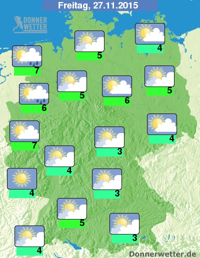 Heute ist es über dem Land oft locker oder aufgelockert bewölkt, vor allem über der Südosthälfte ist es auch gebietsweise sonnig, dazu bleibt es vorerst überall trocken. Gegen frühen Abend kommen im Nordwesten und später auch im Westen dichte Wolken und zeitweiliger Regen auf, sonst bleibt es aber trocken. Die Temperatur steigt auf 3 Grad in München und bis 7 Grad im Rheinland.