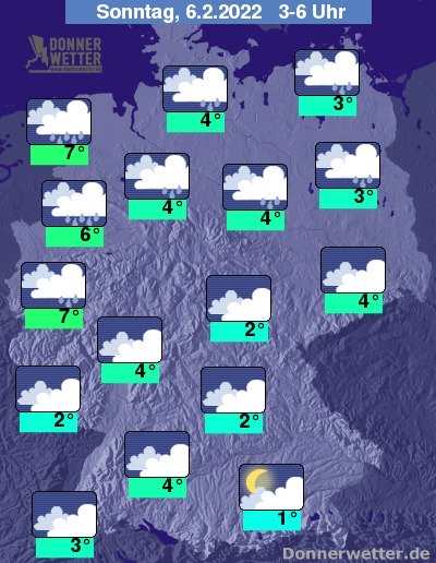 In der kommenden Nacht bleibt der Himmel bedeckt, lediglich am Alpenrand sind Auflockerungen möglich. Über der Südhälfte des Landes bleibt es weitgehend trocken, im übrigen Land fällt jedoch verbreitet, teils langanhaltend Regen. Die Temperatur sinkt auf 7 Grad am Niederrhein und bis 1 Grad im Berchtesgadener Land. Es ist mit Ausnahme des Südens verbreitet stürmisch, an den Küsten herrscht teils schwerer Sturm.