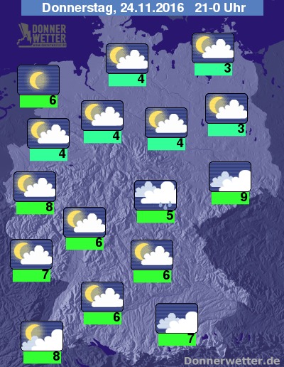 Vielerorts funkeln in der ersten Nachthälfte die Sterne, lediglich in Teilen Sachsens und Thüringens sind ein paar Topfen möglich. Unter klarem Himmel fallen die Temperaturen vor allem im Norden des Landes Richtung Gefrierpunkt, im Süden bleibt es bei Tiefstwerten um die 7 Grad etwas milder.