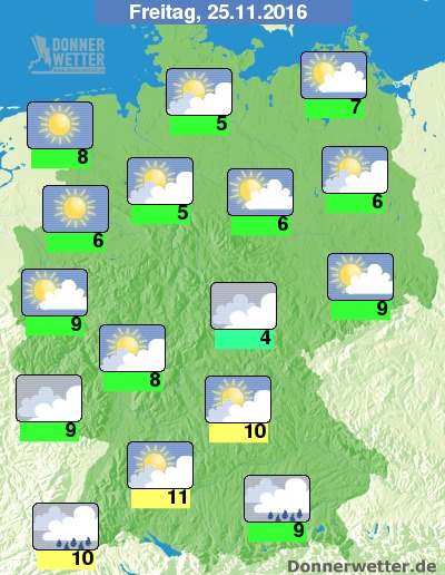 Der Freitag bringt dann insbesondere in der Nordhälfte und in Küstennähe zahlreiche Sonnenstunden. Richtung Süden nimmt die Bewölkung langsam zu und im Schwarzwald und am Alpenrand muss mit teils kräftigen Schauern gerechnet werden. Die Höchstwerte liegen zwischen 5 Grad in Bremen und 11 Grad in Stuttgart.