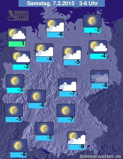 In der Nacht zum Samstag bleibt der Himmel vor allem nach Südwesten hin überwiegend sternenklar, sonst ziehen dagegen auch teils einige Wolken auf, die jedoch keine Niederschläge mit sich bringen. An den östlichen Mittelgebirgen bildet sich regional Nebel. Die Temperatur sinkt auf 1 Grad an der Nordseeküste und bis -9 Grad in Ingolstadt.