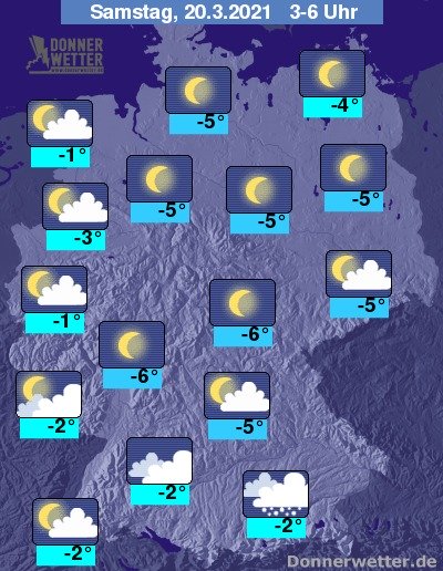 In der kommenden Nacht klart der Himmel mit Ausnahme des Südens verbreitet auf oder es ziehen noch lockere Wolkenfelder durch. Im Süden fällt unter oft dichten Wolken noch gebietsweise Schnee, sonst bleibt es trocken. Die Temperatur sinkt auf -1 Grad an der Nordsee und bis -6 Grad am Thüringer Wald.