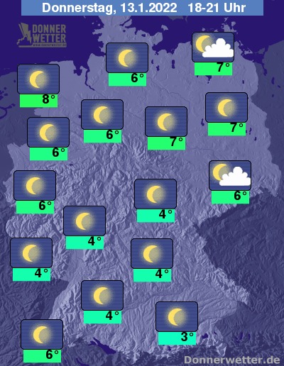 Heute Abend zeigt sich der Himmel verbreitet sternenklar, lockere Wolkenfelder sind über dem Nordosten und Osten des Landes unterwegs, dazu bleibt es trocken. Die Temperatur liegt bei 3 Grad in München und bis 8 Grad in Wilhelmshaven.