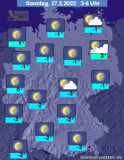 In der Nacht zum Sonntag sind von der Ostsee bis ins südliche Brandenburg hier und da einige Wolken möglich, sonst zeigt sich der Himmel über dem Bundesgebiet aber verbreitet sternenklar, dazu bleibt es trocken. Die Temperatur sinkt auf 3 Grad in Berlin und bis -3 Grad in Jena.