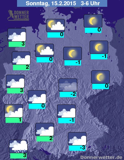In der Nacht zum Sonntag fällt im Südwesten des Landes gebietsweise Regen, sonst bleibt es weitgehend trocken, aber mehrheitlich stark bewölkt. Im Nordosten, Osten und Südosten ist es anfangs schon verbreitet sternenklar, im weiteren Nachtverlauf klart es auch im Norden und in der Landesmitte mehr und mehr auf. In den anderen Landesteilen ist es dann teils stark, teils aufgelockert bewölkt und dazu trocken. Nur im Südwesten ist hier und da etwas Regen oder Schneeregen möglich. Die Temperatur sinkt auf 3 Grad in Aachen und bis -3 Grad in Landshut.