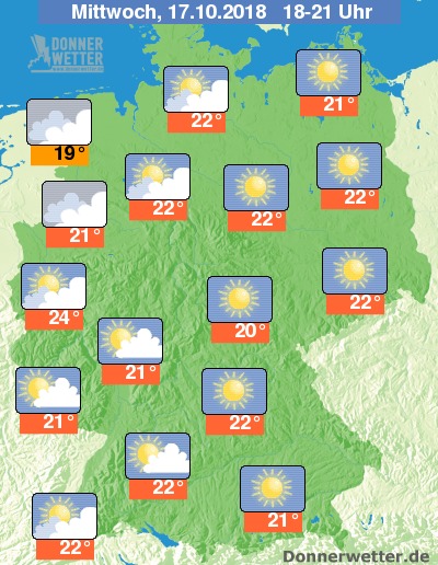 Die untergehende Abendsonne verzaubert viele noch mit ihren goldenen- und wärmespendenden Oktoberstrahlen, nur im Nordwesten bleiben die Wolkenschleier dichter und lassen kaum mehr Licht durch. Regen fällt jedoch nicht. Die Temperaturen liegen vor Dämmerungsbeginn meist noch bei angenehmen 20 bis 24 Grad, etwas kühler bleibt es an der Küste.