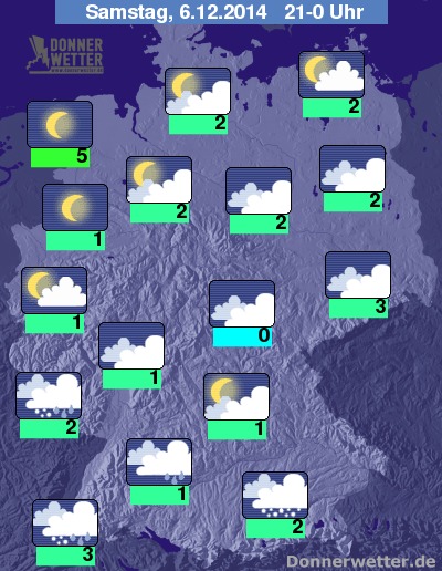 Am heutigen Abend fällt am Nordrand der Alpen zeitweise Schnee, weiter nördlich ist es ebenfalls meist bedeckt oder trüb, jedoch fällt hier nur noch gelegentlich etwas Regen, in den höheren Lagen auch Schneeregen oder Schnee. Verbreitet aufgelockert bewölkt oder sternenklar zeigen sich dagegen weite Teile des Westens, Nordwestens und des Nordens von Deutschland, hier bleibt es trocken. Die Abendtemperatur liegt bei 5 Grad im Norden Ostfrieslands und um 0 Grad im Vogtland.