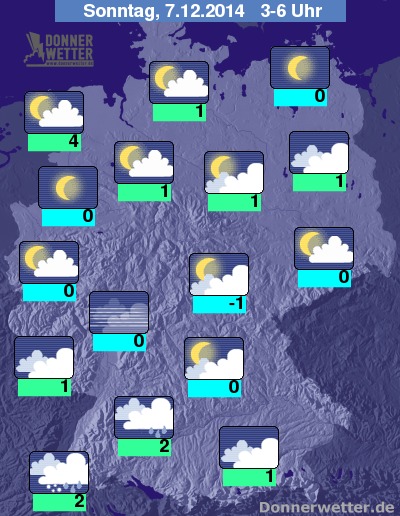 In der Nacht zum Sonntag fällt am Alpenrand zeitweise noch weiterer Schnee oder Schneeregen, dabei kann es weiterhin gefährlich glatt sein, nördlich anschließend ist es überwiegend trüb oder bedeckt, dabei bleibt es jedoch weitgehend trocken. Im Norden und Westen der Republik zeigt sich der Himmel auch oft aufgelockert bewölkt oder sternenklar, dazu bleibt es trocken. Stellenweise bildet sich Nebel oder Hochnebel. Die Temperatur sinkt auf 4 Grad in Emden und bis örtlich auf -2 Grad im Vogtland.