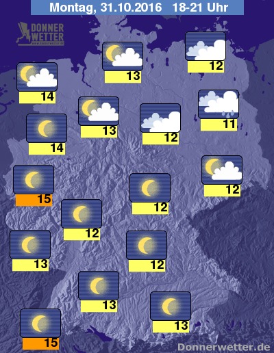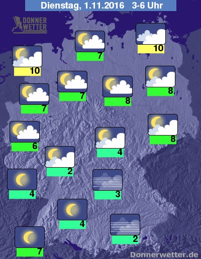 In der Halloweennacht halten sich vom Osten bis zum Nordosten meist dichte Wolken aus denen es gelegentlich regnen kann. Im Norden ist es meist aufgelockert bewölkt, aber trocken. Im großen Rest der Republik zeigt sich der Himmel weitgehend sternenklar, dabei bleibt es trocken.
