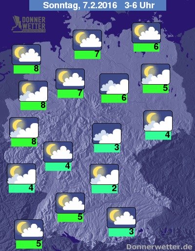 In der Nacht zum Sonntag ist es zunächst verbreitet locker bis aufgelockert, gebietsweise aber auch schon stark bewölkt, dazu ist es noch trocken. Von Westen her werden die Wolken jedoch rasch dichter und gegen Morgen kommt in den westlichen Landesteilen Regen auf, sonst bleibt es noch weitgehend trocken. Die Temperatur sinkt auf 8 Grad im Rheinland und bis 2 Grad in Mittelfranken. Im Norden und Westen weht ein teils starker, an der Nordsee ein teils stürmischer Wind.