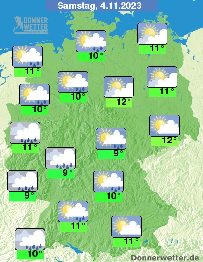 Am Samstag breiten sich über der Westhälfte dichte Wolken aus, die ab dem Mittag teils schauerartigen Regen bringen. In den übrigen Landesteilen überwiegt am Samstag ein Mix aus Sonne und lockerer oder aufgelockerter Bewölkung; dabei muss, ausgenommen östlich der Elbe, zeitweise mit Schauern gerechnet werden.