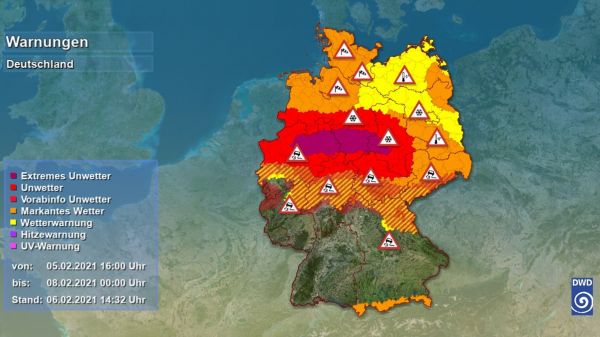 Am Sonntag bleibt es über der Nordhälfte bedeckt und es fällt immer wieder, zum Teil kräftiger Schnee, dabei weht ein oft stürmischer Wind. Zur Landesmitte hin ist es ebenfalls bedeckt, hier fällt verbreitet Regen, teils auch Schneeregen oder Eisregen. Im Süden ist es bedeckt und es fällt gebietsweise Regen. Die Temperatur steigt auf eiskalte -5 Grad im Berliner Umland und bis zu 11 Grad im Raum Stuttgart.