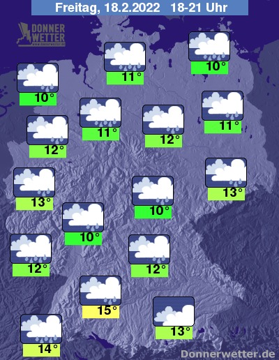 Heute Abend bleibt es weiterhin bedeckt und es fällt gebietsweise Regen. Der Wind weht im Süden teils stark, sonst verbreitet stark bis stürmisch mit teils schweren Sturmböen. An den Küsten und auf den Bergen sind teils orkanartige Böen möglich. Die Temperatur liegt bei 10 Grad im Eichsfeld und rund 15 Grad in Baden.