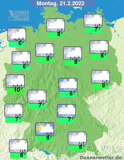 Am Montag bleibt es über der Bundesrepublik meist stark bewölkt oder bedeckt, hier und da zeigen sich mögliche Auflockerungen. Es fällt zeitweise Regen, zum Teil auch Schneeregen oder Schnee. Es weht ein verbreitet starker und teils stürmischer Wind, an der See herrscht Sturm. Die Temperatur steigt auf 6 Grad in Erfurt und bis 10 Grad in Bonn.