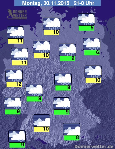 Heute Abend bleibt es landesweit bei dichten Wolken, dazu fällt verbreitet langanhaltender und zum Teil ergiebiger Regen. Die Abendtemperatur liegt bei milden 12 Grad in Düsseldorf und um 5 Grad in Neubrandenburg. Der Wind weht überwiegend stark bis stürmisch mit teils schweren Sturmböen, auf den Bergen und an den Küsten sind einzelne orkanartige Böen möglich.