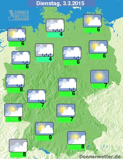 Am Dienstag ist es im Osten und Süden des Landes zunächst oft heiter oder aufgelockert bewölkt und trocken. Im Westen ziehen bereits weitgehend dichte Wolken mit teils kräftigem Regen durch. Im Tagesverlauf breiten sich die dichten Regenwolken auch nach Osten und Norden hin aus, im Süden und Südosten bleibt es dagegen bei meist aufgelockerter, teils auch starker Bewölkung weitgehend trocken. Die Höchstwerte erreichen 4 Grad am Rande des Harzes und bis 9 Grad in Stuttgart. Es weht verbreitet frischer und teils auch starker Wind, auf den Bergen und an der See weht der Wind meist stark mit stürmischen Böen.