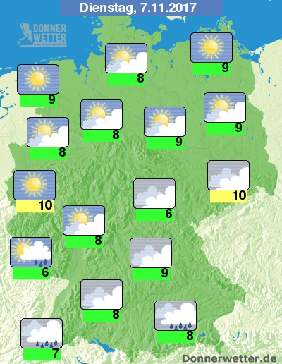 Vor allem von Rheinland-Pfalz, über Hessen bis nach Niedersachsen kann es nach einer teils klaren Nacht zu leichtem Morgenfrost mit Reif kommen. Tagsüber wechseln sich nach Nebelauflösung im Nordwesten und Norden Sonne und Wolken miteinander ab, sonst bleibt es eher trübe. Ganz im Süden fällt gelegentlich etwas Regen, auf den Bergen auch Schnee. Die Temperaturen klettern dabei bis zum Nachmittag auf 6 bis 11 Grad. Dabei ist es meistens schwachwindig. In der Nacht auf Mittwoch kann sich im Südwesten ein kleines Niederschlagsgebiet ausbilden, sonst ist es teils bewölkt, teils klar mit örtlichem Nebel.