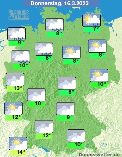 Am Donnerstag ziehen meist dichte Wolken durch, im Süden und Osten ist es gebietsweise auch locker bewölkt, hier bleibt es trocken. Im übrigen Land ist jedoch Regen möglich. Die Temperatur erreicht 7 Grad auf Rügen und bis 14 Grad am Oberrhein. An der Nordsee weht ein zeitweise stürmischer Wind.