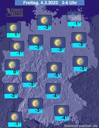 In der Nacht zum Freitag bleibt der Himmel verbreitet sternenklar, nur stellenweise kann sich Dunst oder Nebel bilden. Es bleibt überall trocken bei 1 Grad in Wilhelmshaven und -5 Grad in Jena.