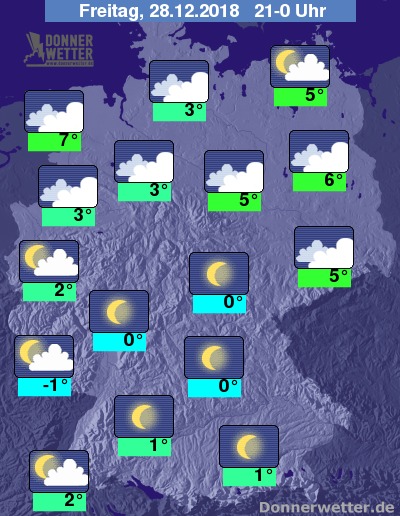 In der Mitte und im Süden bleibt es teils neblig-trübe, teils leuchten Mond und Sterne und die Luft kühlt häufig in den Frostbereich ab. Stellenweise muss mit Glätte durch überfrierende Nässe, oder Reifablagerungen gerechnet werden.