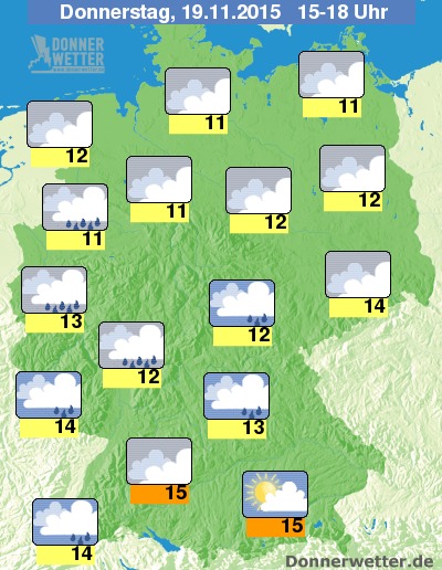 Heute Nachmittag halten sich über dem Bundesgebiet weitgehend dichte Wolken, dabei fällt im Westen schon häufig Regen, sonst ist es zunächst noch größtenteils trocken. Im weiteren Verlauf breitet sich der teils kräftige und langanhaltende Regen aber weiter nach Osten hin aus. Im Nordosten und Süden bleibt es aber weitgehend trocken. Die Temperatur steigt auf 11 Grad an der Müritz und bis 15 Grad in München. Es weht oft starker, im Norden verbreitet stürmischer Wind. An den Küsten und in den Hochlagen der norddeutschen Mittelgebirge herrscht Sturm.