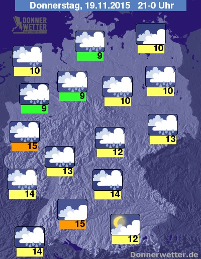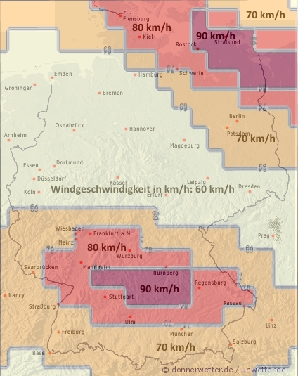 Die nachfolgende Karte zeigt die durch Sturm Iwan zu erwartenden Windgeschwindigkeiten in Deutschland (Donnerstag,19.11.2015, 14:00 bis 24:00 Uhr):