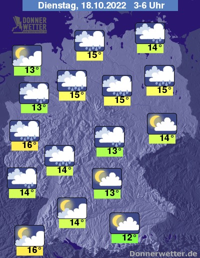 In der Nacht zum Dienstag zieht ein Regenband vom Nordwesten her bis über die breite Landesmitte hinweg. Im Nordseeumfeld lockert es im Verlauf wieder auf und dann bleibt es hier trocken. Im Süden und über Sachsen ist es bis zum Morgen ebenfalls noch trocken und vor allem in der ersten Nachthälfte noch meist locker bewölkt. Die Temperatur sinkt auf 16 Grad im Breisgau und bis 12 Grad im Berchtesgadener Land.