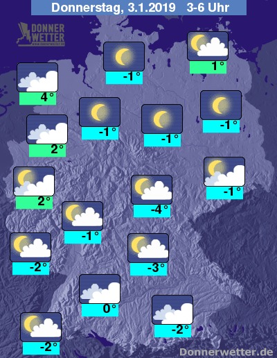 Bis zu den Frühstunden kühlt sich die Luft auf -5 bis 0 Grad ab. Frostfrei bleibt es wahrscheinlich nur in den Ballungsgebieten des Westens, sowie im Küstenbereich von Nord- und Ostsee.
