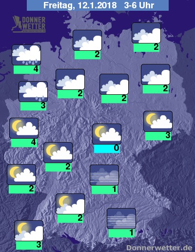 Im Lauf der Nacht zieht das Regengebiet im Norden weiter westwärts und erreicht bis zum Morgen die Nordseeküste. Dahinter ist der Himmel in der Nacht meist dicht bewölkt. In der Südhälfte zeigen sich hingegen größere Wolkenlücken, lediglich in Teilen Bayerns bilden sich am Morgen dichte Nebelfelder.