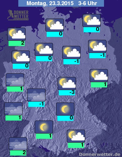 In der Nacht zum Montag klart der Himmel vor allem im Süden häufig auf, stellenweise bildet sich jedoch Nebel oder Hochnebel. Sonst ist es meist locker, im Küstenumfeld größtenteils aufgelockert bewölkt. Es bleibt trocken bei Tiefstwerten von 2 Grad im nördlichen Emsland und bis -3 Grad im Vogtland.