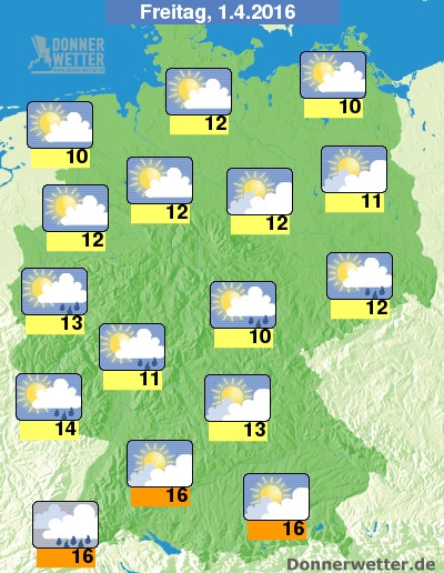 Am Freitag fällt anfangs in einem breiten Streifen vom Saarland bis nach Sachsen noch gebietsweise Regen, im weiteren Verlauf lockert es hier auf und es bleibt trocken. Im Süden und Südosten bleibt es dagegen meist stark bewölkt und hier und da fällt etwas Regen. In den übrigen Landesteilen ist es verbreitet heiter oder sonnig und dazu trocken. Die Temperatur steigt auf 10 Grad in Rostock und bis 16 Grad am Bodensee.