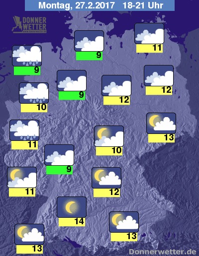 Heute Abend fällt vom Mittel- bis zum Niederrhein und dem Emsland verbreitet Regen, der Niederschlag breitet sich im Laufe des Abend noch weiter nach Osten hin aus. Über der Osthälfte der Republik und in Süddeutschland bleibt es bei teils leichter, teils starker Bewölkung dagegen trocken. Die Abendwerte liegen zwischen 9 und 14 Grad.