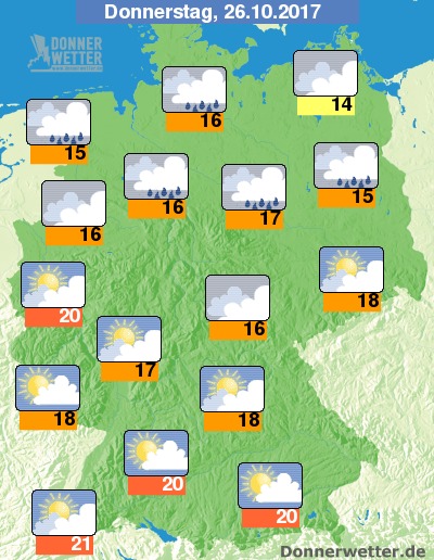 Am Donnerstag bleibt es über der Südhälfte Deutschlands meist wechselnd bis aufgelockert bewölkt und dabei trocken. Weiter nach Norden hin werden die Wolken hingegen zunehmend dichter und es fällt auch gebietsweise Regen. Die Temperatur steigt auf 14 Grad in Rostock und bis 21 Grad in Freiburg.
