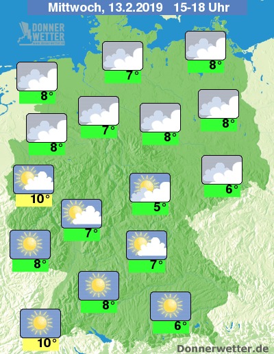 Am Nachmittag halten sich in der Nordhälfte meist dichte, zähe Schichtwolken einer schwachen Warmfront, aus der es stellenweise auch etwas tröpfeln oder nieseln kann. In der Mitte wechseln sich Sonne und Wolken miteinander ab. Nach Süden und Südwesten wird es immer freundlicher und die Sonne schein längere Zeit.