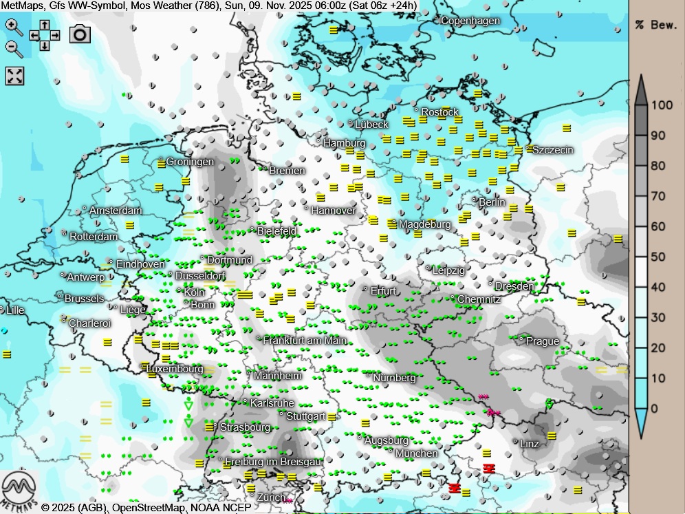 Am Sonntag kann sich zunächst verbreitet zäher Nebel oder Hochnebel halten, teils ist es auch ganztägig trüb. Etwas Sonnenschein gibt es am Sonntg vor allem in den Hochlagen der Mittelgebirge sowie im äußersten Westen. Lokal kann heute etwas Regen oder Sprühregen fallen.