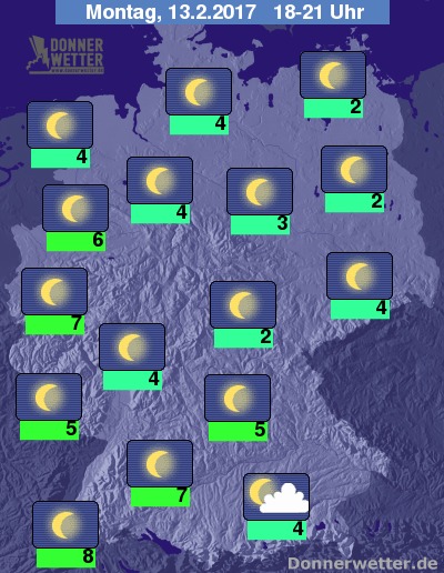 Heute Abend zeigt sich Deutschland verbreitet sternenklar, einige, teils dichte Wolken können sich über Oberbayern halten. Es bleibt bundesweit trocken bei Werten zwischen 2 und 8 Grad C.