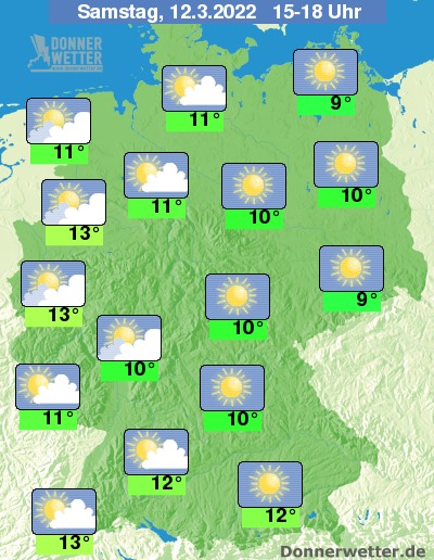 Die Temperaturen erreichen Werte um 9 Grad in der Lausitz, 11 Grad im Saarland und 13 Grad im Breisgau.