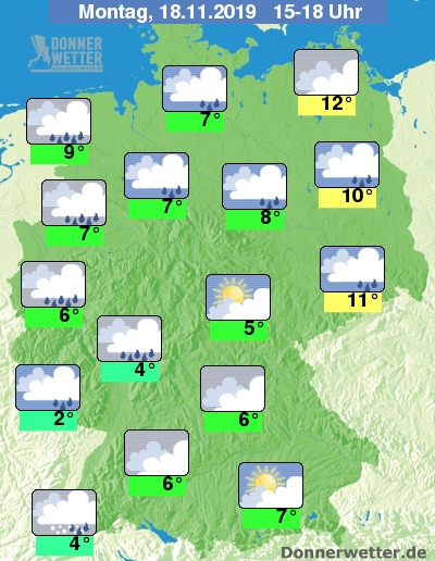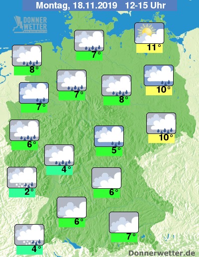 In den Nachmittagsstunden ist der Himmel über weiten Teilen des Landes bedeckt, an den Alpen sowie an der Ostseeküste kann es kurzzeitig auch mal auflockern. Verbreitet fällt in den kommenden Stunden Regen, der vor allem in der Nord- und Westhälfte zeitweise auch kräftig niedergehen kann. In den höheren Lagen im Südwesten können die Niederschläge auch als Schneeregen oder Schnee fallen.