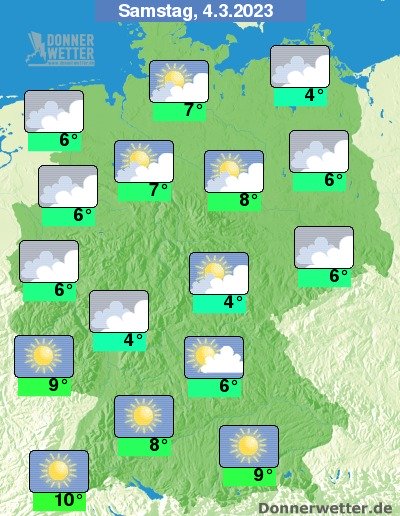 Am Samstag ist es zumeist stark bis dicht bewölkt, dabei fallen allerdings nur selten ein paar Tropfen. Im Süden zeigt sich das Wetter oft heiter bis sonnig, dabei bleibt es trocken. Die Temperatur steigt auf 4 Grad in Rostock und bis 10 Grad in Freiburg.