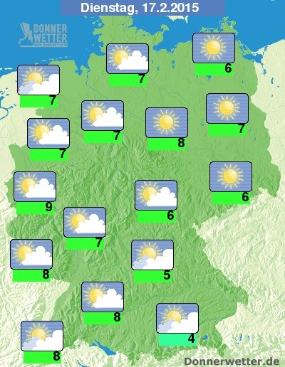 Am Karnevalsdienstag scheint im Osten und Nordosten die Sonne von einem weitgehend blauen Himmel. In den anderen Landesteilen ziehen meist mehr oder weniger viele Wolken durch, dabei kann sich jedoch auch häufig die Sonne zeigen. Es bleibt trocken bei Höchstwerten zwischen 4 Grad in München und bis 9 Grad in Köln.