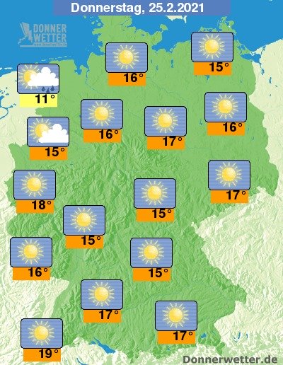 Am Donnerstag ist es zunächst verbreitet sonnig, im Tagesverlauf ziehen allerdings im Norden und Westen mehr und mehr Wolken herein. Es bleibt aber noch weitgehend trocken, lediglich im nördlichen Emsland sind gegen Abend einige Tropfen möglich. Die Temperatur steigt auf 11 Grad an der Nordsee und bis 19 Grad im Breisgau.