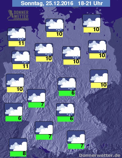 Heute Abend halten sich weitgehend dichte Wolken, die besonders über der Nordhälfte zeitweise Regen bringen. Im Süden bleibt es hingegen weitgehend trocken. Die Temperatur liegt bei 6 bis 11 Grad. An der Nord- und der Ostsee weht ein zum Teil stürmischer Wind.