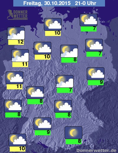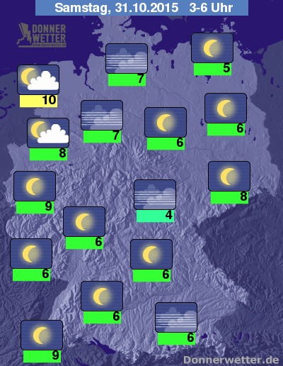 In der Nacht zum Samstag ziehen vor allem über dem Norden und Westen noch oft dichte Wolken durch, sonst ist es meist locker bewölkt oder schon sternenklar. Im weiteren Nachtverlauf klart der Himmel aber über dem Bundesgebiet verbreitet auf, vor allem nach Nordwesten hin halten sich jedoch meist lockere Wolken. Es bleibt landesweit trocken. Die Tiefstwerte liegen bei 10 Grad an der Nordsee und 4 Grad im Grabfeld. Stellenweise bildet sich wieder Nebel oder Hochnebel.